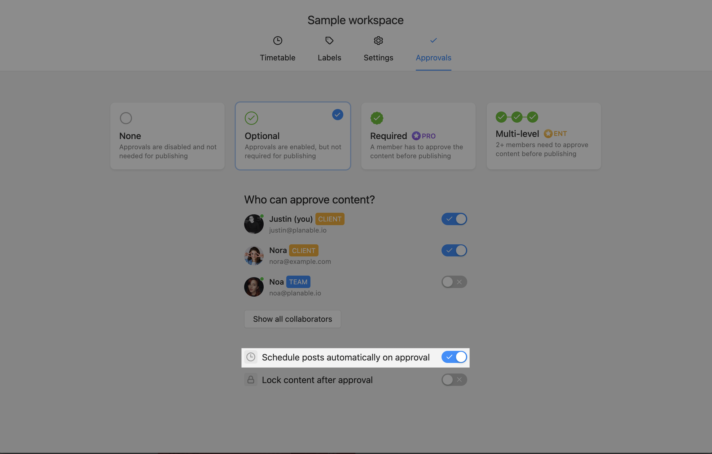 In Planable you can save time and clicks by enabling the automatic scheduling of approved posts. If a post has a date & time set, once it's been approved it will automatically be scheduled.
