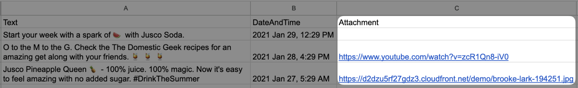 To correctly import the assets along with posts, make sure the Attachment column contains a link to the file that is available for direct download, such as a link from a website like WordPress or Imgur.