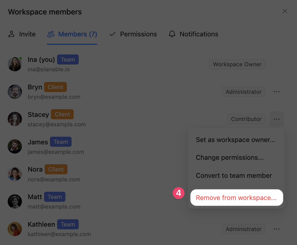 If you added a team member/client by mistake or the user should no longer be part of the workspace, you can easily remove them.