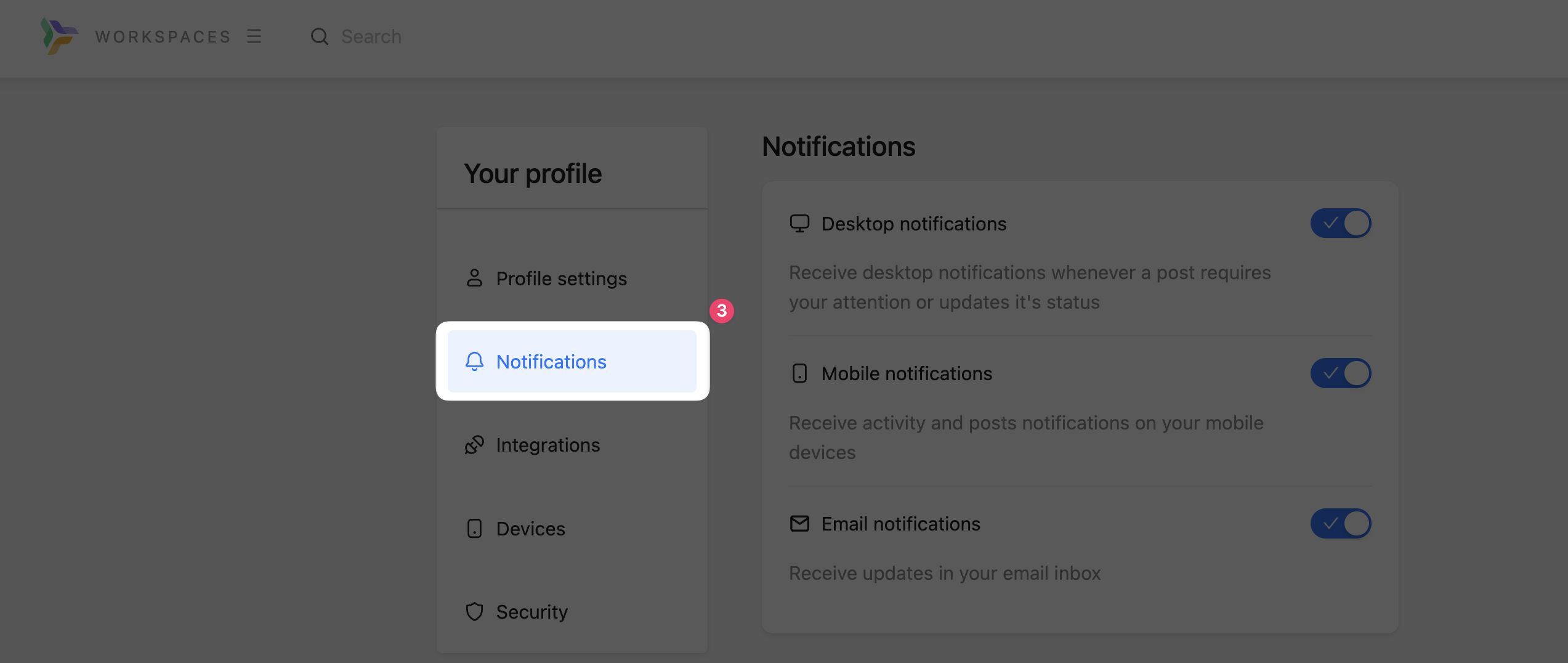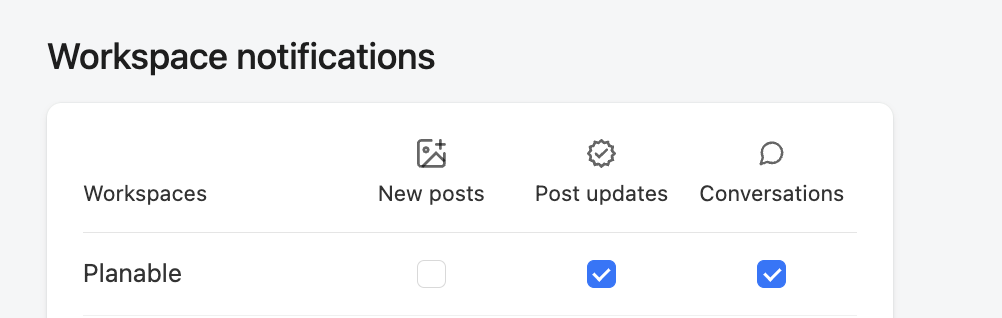 Lastly, you can choose to receive notifications for new posts in the workspace, updates on post status (like approvals or publishing), or notifications for conversations and discussions within the workspace.