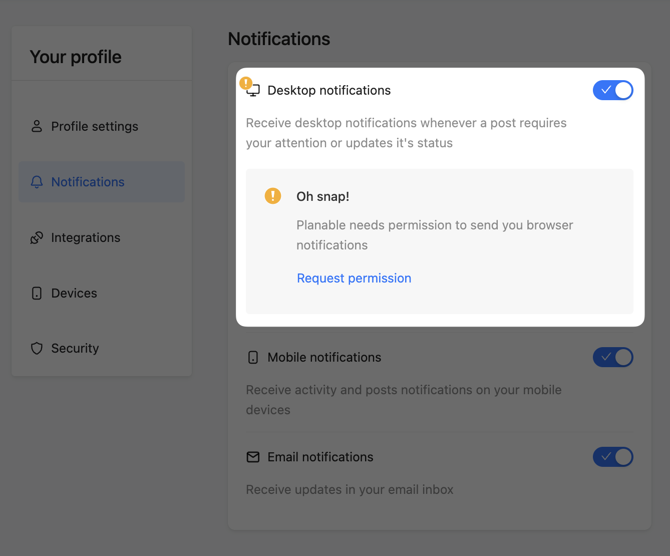 Be mindful, desktop notifications require permission from your browser to function properly.