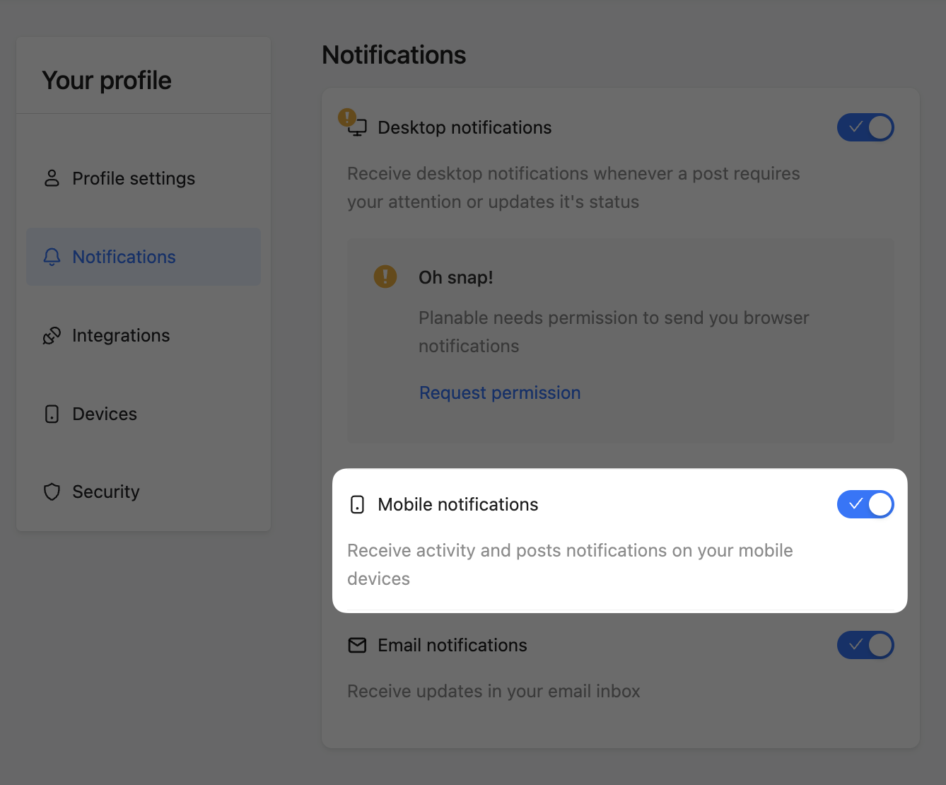 Planable helps you stay on top of everything with customizable notifications. Whether you prefer updates on your desktop, mobile, or email, you’ll always be in the loop.
