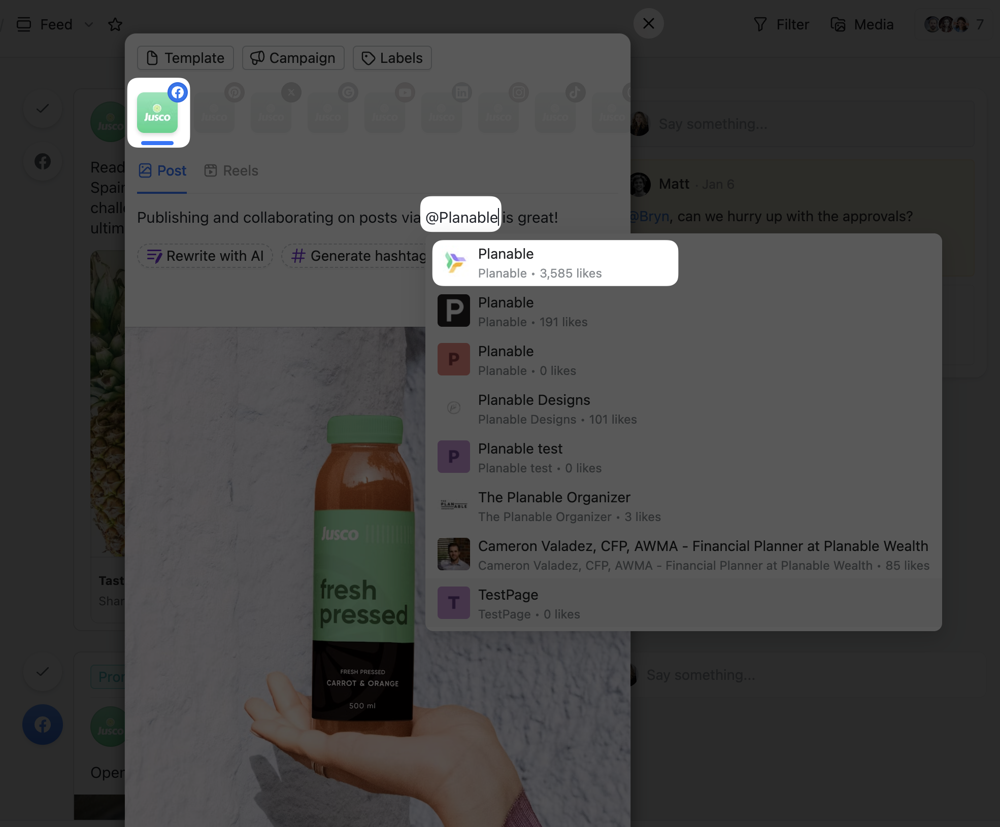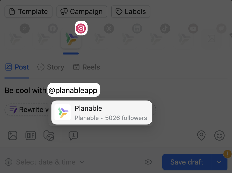 For Instagram, you can tag accounts in the caption or on the image. To tag other accounts in the caption, all you need to do is type in "@" followed by the page handle or username. Since on Instagram the "@" is kept in front of the name when tagged, even if the account you're looking for might not come up as suggested if it's the right handle, it will be tagged once published.
