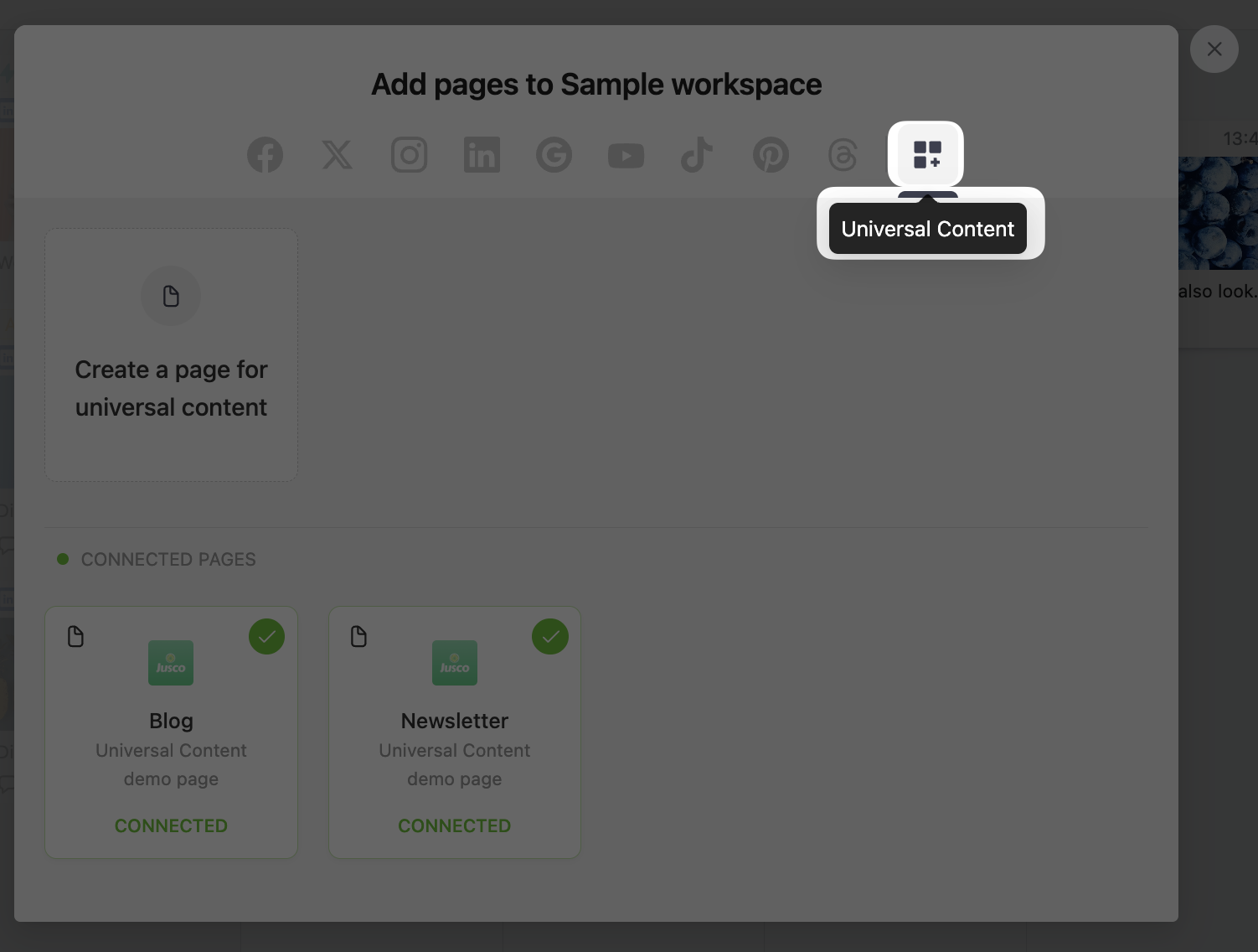 First of all, make sure you have a Universal Content page added to your workspace. Go to "Add page":
