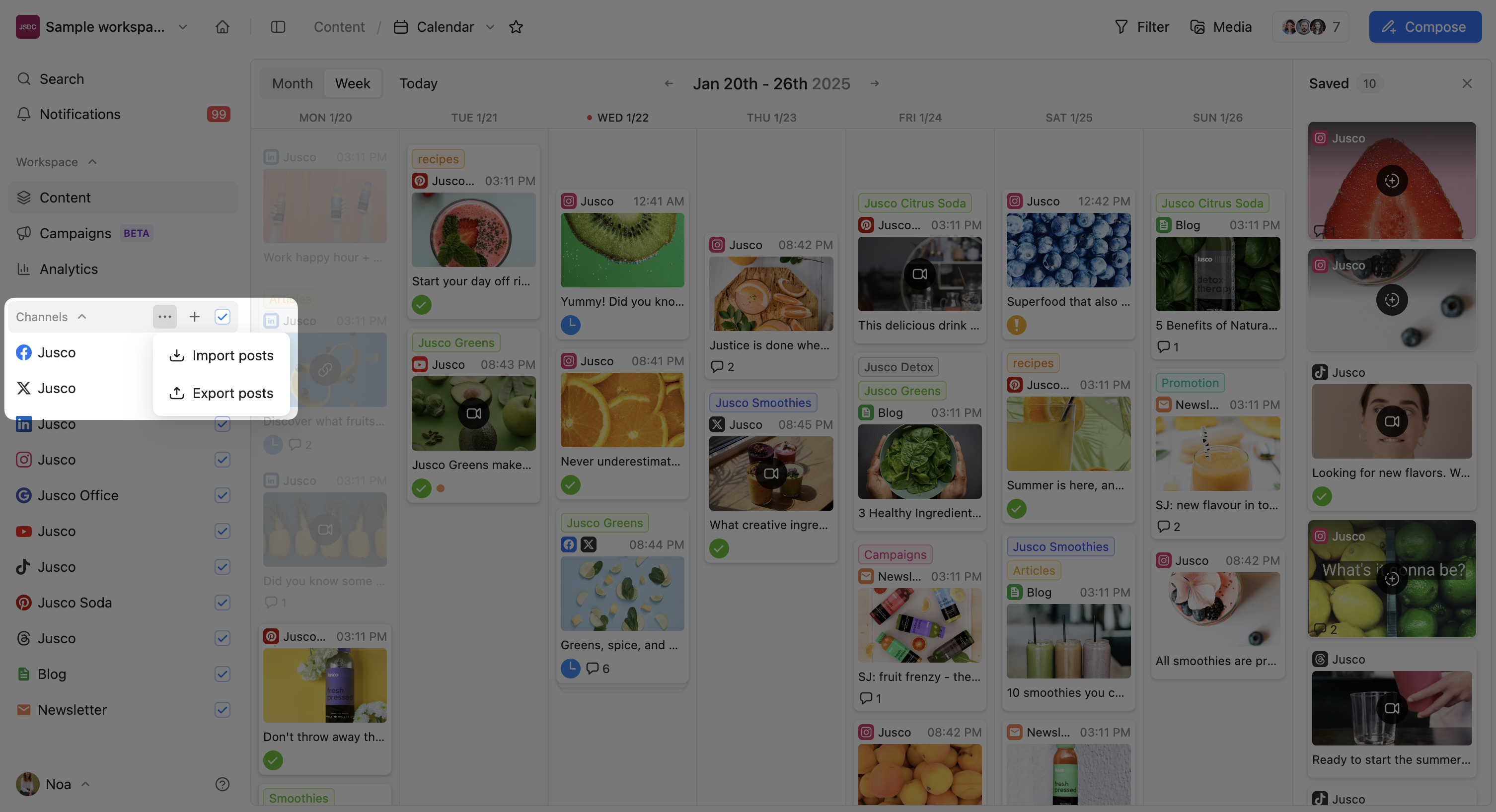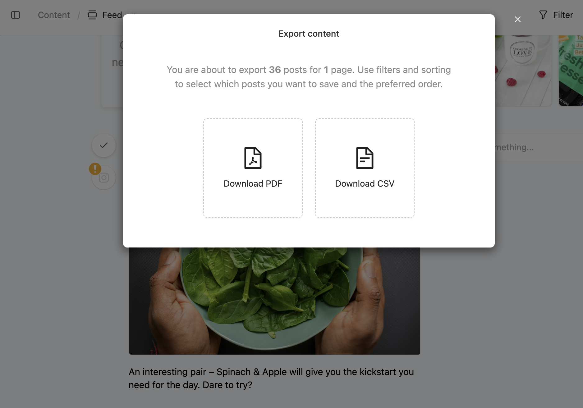 In Planable you can easily export posts and save them in a file. You can choose to save the posts in CSV or PDF format. PDF format is available for Facebook, Instagram, LinkedIn & X and it will include previews of the assets, while CSV is available for all pages and will include structured data about the posts and links to the media files.