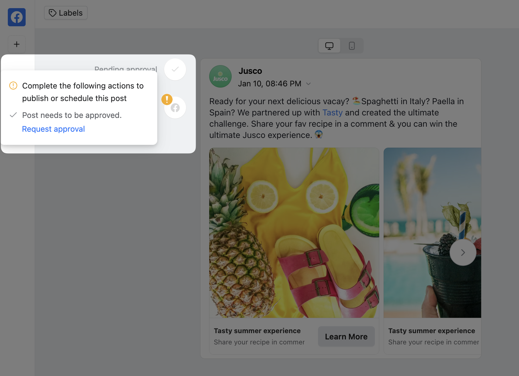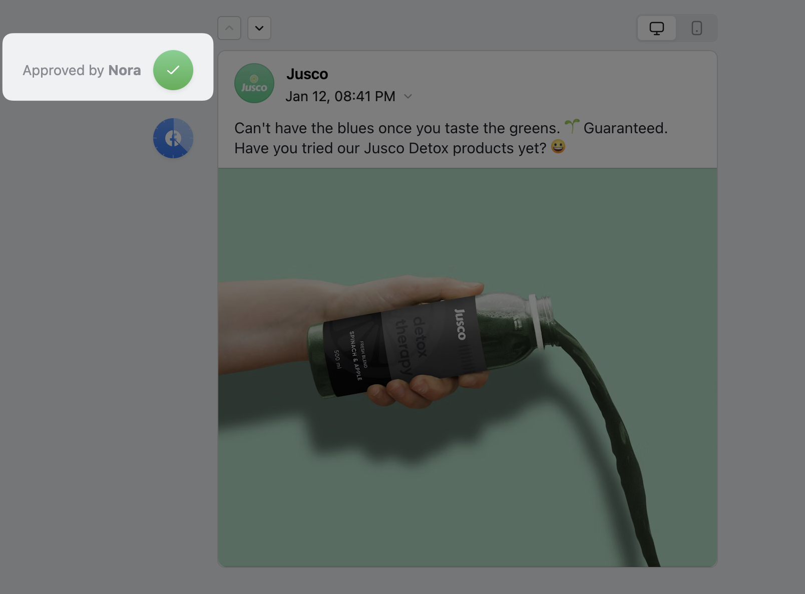 We refer to approval as the ability of a user to give a virtual thumbs-up for a post to be published. It's one of the main pillars of collaboration found within our tool.