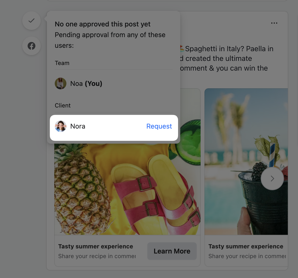 You can request approval on posts by hovering on the approval icon, and then clicking on "Request Approval" in the tooltip that appears.