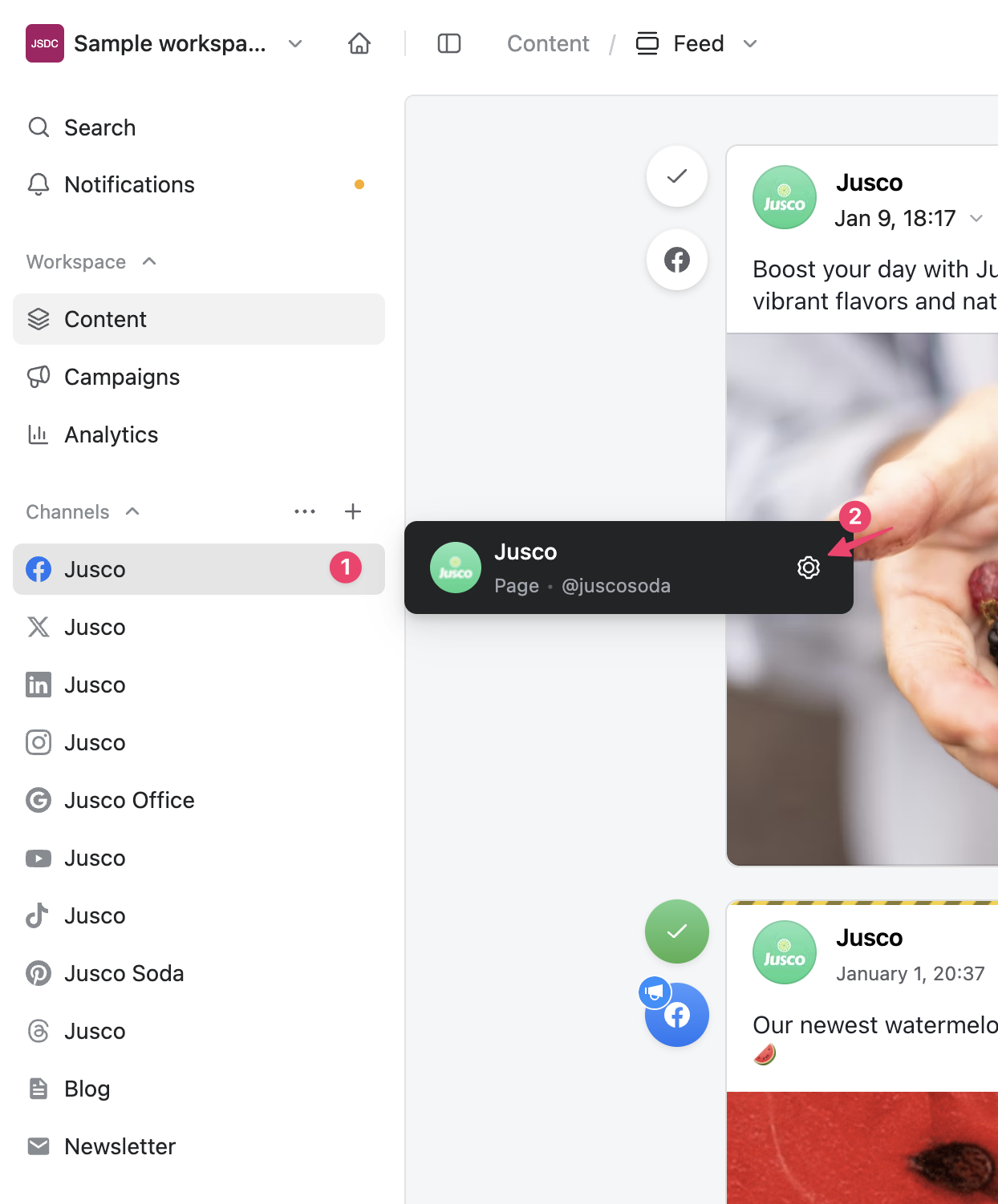 Simply select the page where you want to change the cover or profile photo, hover over the Social Media icon, and click the Settings button.