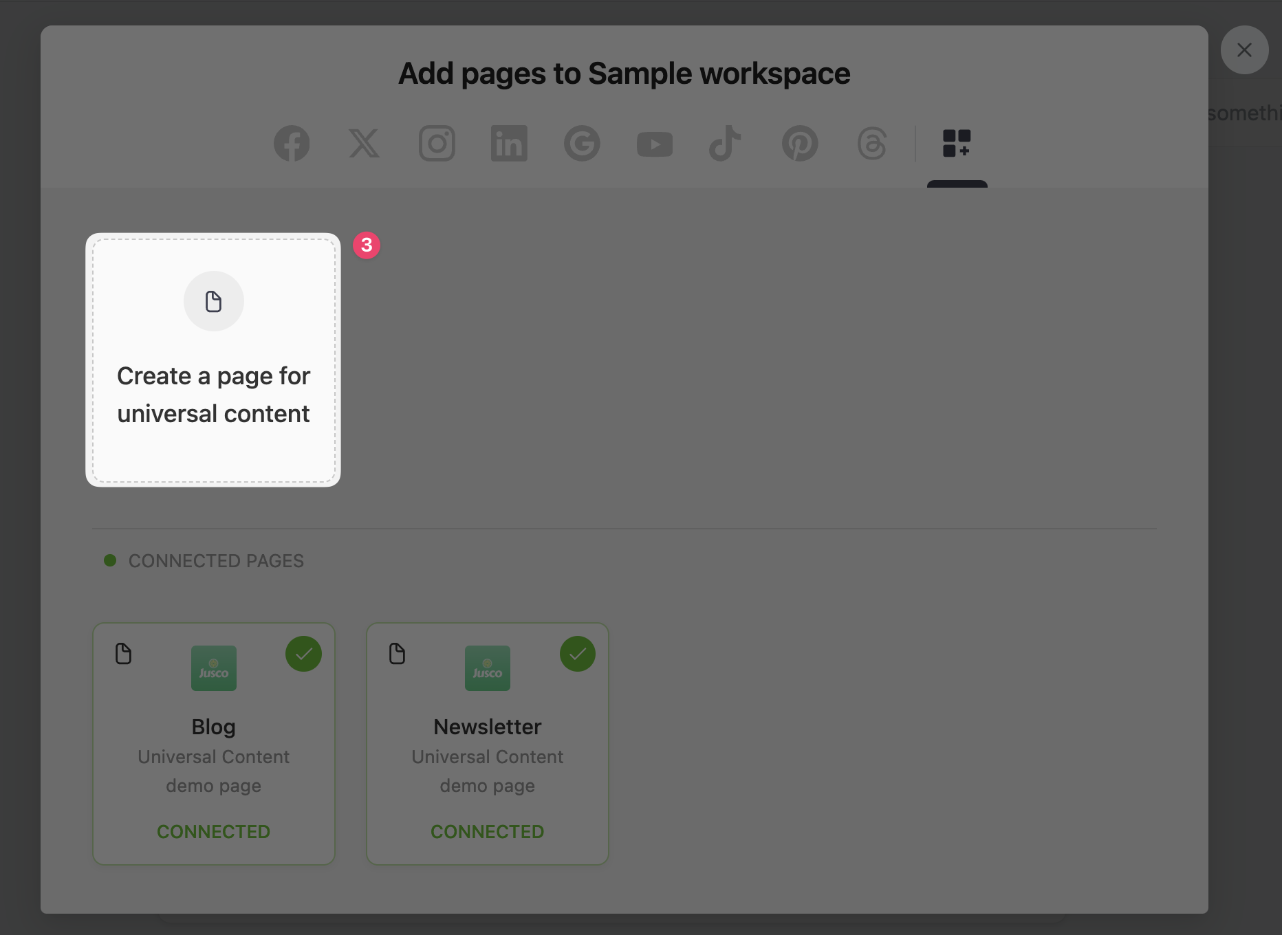 To create a new page, go to "Add pages" and select the last icon on the right for "Universal content".
