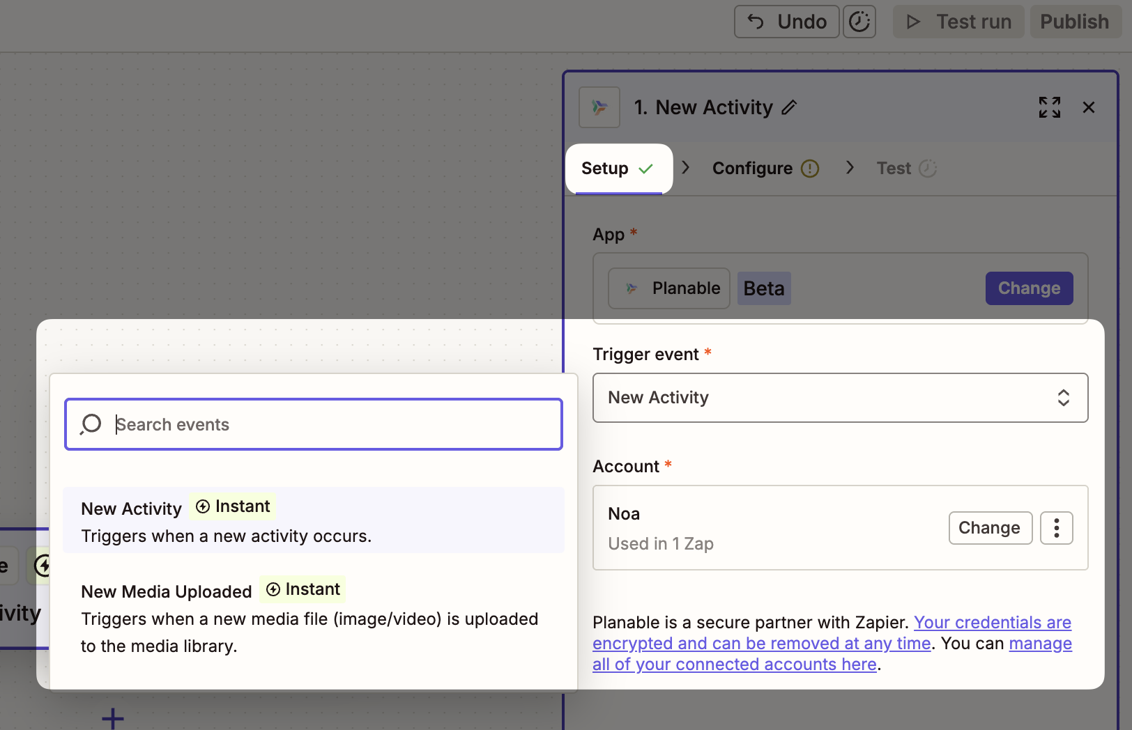 To configure the trigger, go to the Setup section, connect your Planable, and choose if the trigger should be a "New activity" or "New media uploaded."