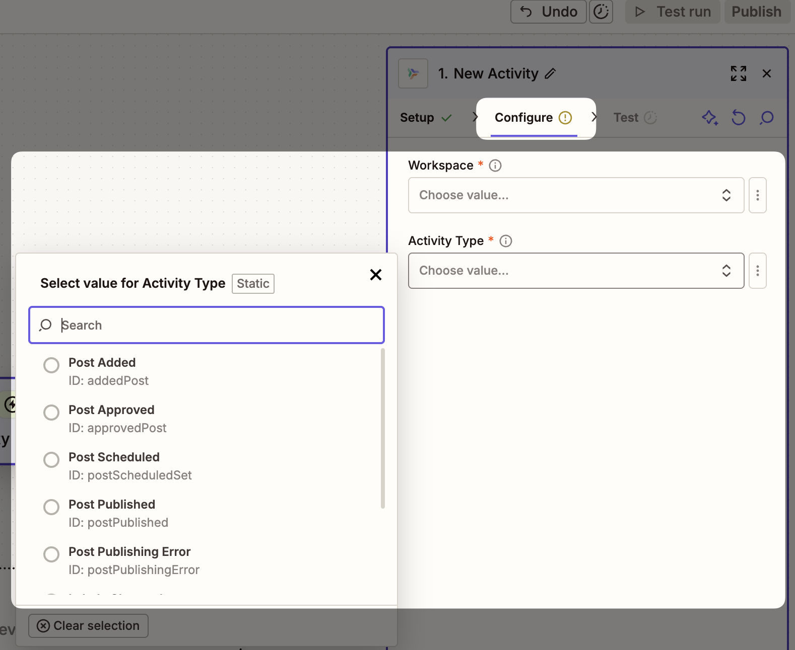 The next step is to configure the trigger: choose the workspace and the specific activity. You can choose between the following: